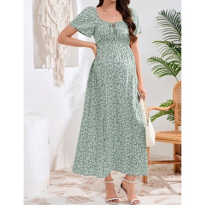Maternity Square Neck Maxi Dress Short Sleeve Floral Summer Dresses With Side Pockets