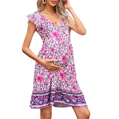 Women's Maternity Puff Short Sleeve Casual Summer Dress V Neck Boho Flowy Swing A Line Maxi Dress for Photoshoot Baby Shower