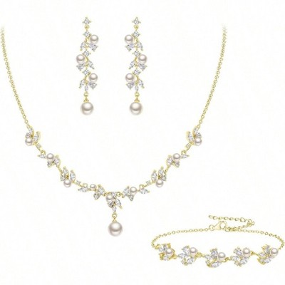 Bridal Jewelry Set: Simulated Pearl Marquise Floral Necklace, Earrings & Bracelet for Wedding