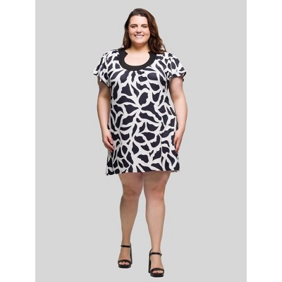 24seven Comfort Apparel Plus Size Black and White Short Sleeve Scoop Neck Mini Dress