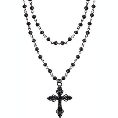 Gothic Cross Choker Necklace - Black Layered Bead Necklace, Emo Grunge Gift for Women