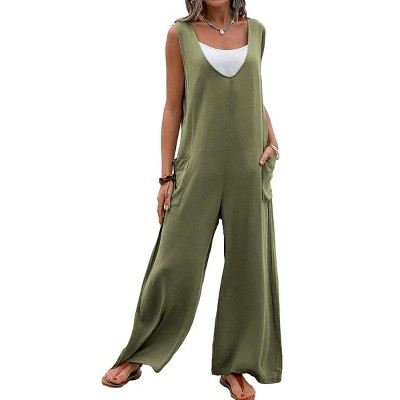 Women's Summer Casual Sleeveless Jumpsuit Spring Wide Leg V Neck Pants Romper Overalls with Pockets