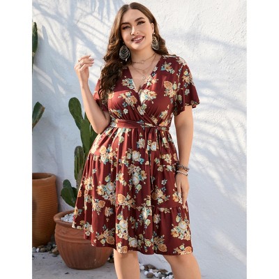 Plus Size V Neck Midi Dress Wrap Short Sleeves High Waisted Summer Casual Belt Dress