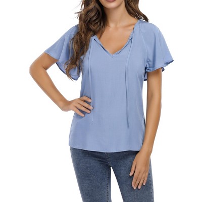 Women Blouse Short Sleeve Ruffle Sleeve Drawstring Casual Women Top