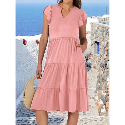 Womens Summer Ruffle Sleeve V Neck Midi Dress Casual Fit Flowy Ruffle Tiered Boho Dress