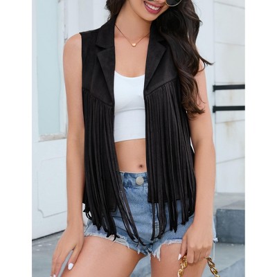 Coolmee Women's Semi-Formal Blazer Vests Open Front Solid Fringe Cardigan Vests Sleeveless Cropped Tassel Office Workplace Vests S Black