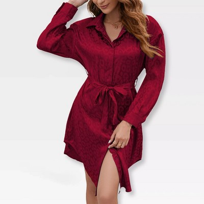 Womens Satin Leopard Long Sleeve Dress Brocade Shirt Dress Button Down Belted Silky Robe Bath Robe