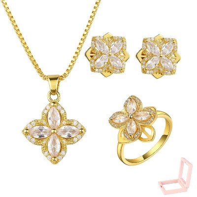 Golden Rotating Clover Jewelry Set, Necklace, Earrings and Ring Set, Women's Square Zirconia Lucky Grass Design, Daily Elegant Accessories and Gifts