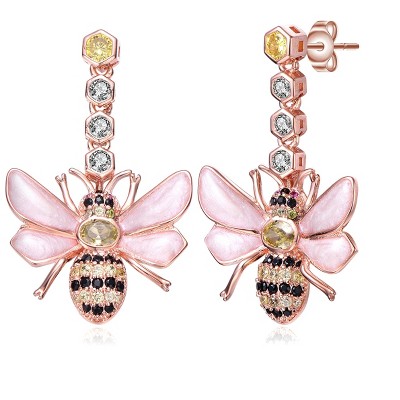 Guili Sterling Silver Rose Gold Plated Dangling Bee Earrings with Colored Cubic Zirconia, a Playful and Elegant Design for Unique Beauty