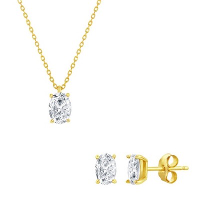Bella Silver Sterling Silver, Gold Plated Solitaire Oval CZ, 5x7mm 18" Necklace & 3x6mm Earrings Set