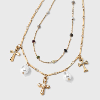 Cross and Pearl Layered Necklace 2pc Set - Wild Fable™ Gold