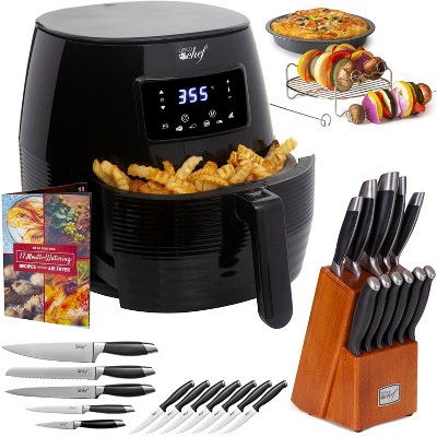 Enjoy your favorite fried food when you have an Air fryer at home. An Air fryer is a kitchen appliance that cooks by circulating hot air around food. They do a fantastic job cooking up frozen foods that are meant to taste deep-fried. You can air fry french fries, crispy chicken wings, mozzarella sticks and more. Air frying gives you the crunchy texture of fried foods without the extra grease and fat. Most fryers are easy to clean, have dishwasher-safe containers and occupy less space than convection ovens. An Air fryer can function like convection ovens, deep-fat fryers, and multi-cookers; they combine benefits of multiple appliances. At Target we have a wide range of Airfryers with different functions and styles. You can choose a fryer that has features to fit your needs. Whether it is a toaster-oven, convection oven or a traditional pot style cooker, you can find one at Target. In the range, you can find cookers that can be pre-programmed if you are someone who is always on the move. We also have different brands to choose from like Chefman, Cusinart, Ninja Foodi, Philips and more. Pick an Air fryer from our superb range and switch to oil-free, oil-less and quick frying.
