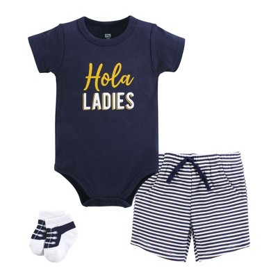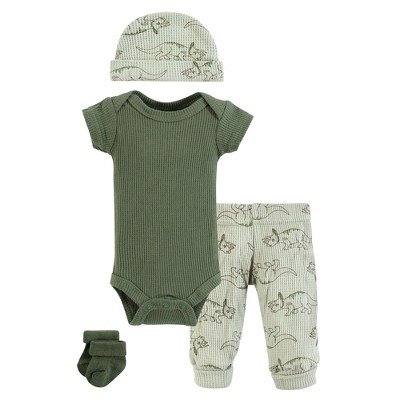 Hudson Baby Infant Boys Bodysuit, Short and Sock, Mamas Boy Sage Dino
