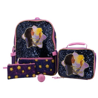 Disney Wish 4 Piece Backpack Set, Flip Sequin 16" School Bag for Girls with Front Zip Pocket, Purple