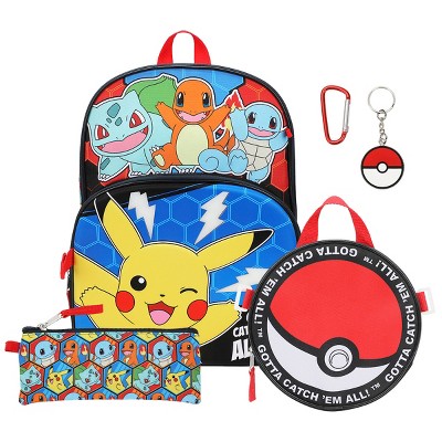 Pokemon 5-Piece Set: 16 Backpack Padded Utility Case Small Utility Case Rubber Keychain and Carabiner