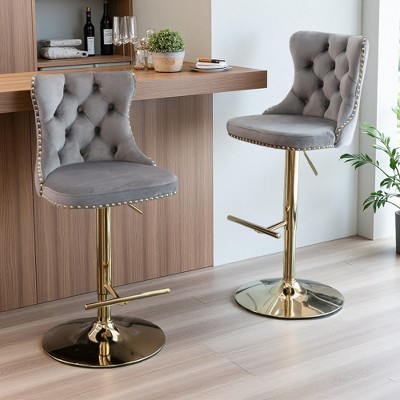 Velvet Button-Tufted Bar Stools with Wood Legs & Nailhead Trim, Set of 2