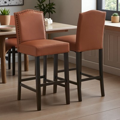 Rustic Wooden Counter Stools with Padded Seat & Nailhead Trim, Set of 2