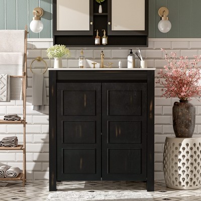 FAMYYT 20 in. Single Sink Freestanding Bath Vanity with White Ceramic Top, Adjustable Shelve, Door Rack