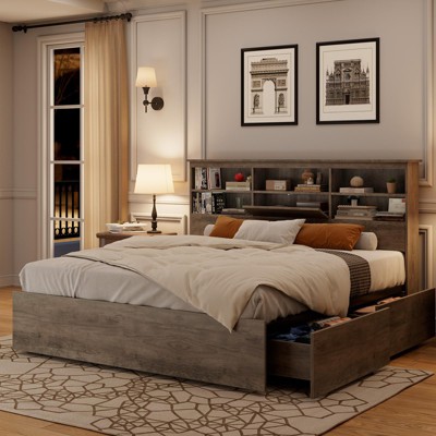 AMERLIFE Platform Bed Frame with Charging Station Storage Headboard, Noise-Free