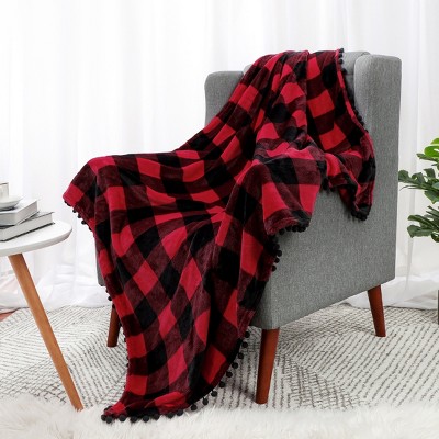 PiccoCasa Soft Plush with Pom Poms Checkered Fleece Throw Blanket