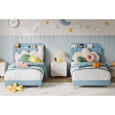 Blue Velvet Upholstered Bed, Metal Frame Platform Bed with Storage Headboard and Shelves
