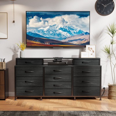 55 inch Black 10 Drawer Dresser for Bedroom LED TV Stand with Charging Station Power Outlets fits 65 inch TV Fabric Storage Chest Media Console Table