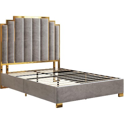 AMERLIFE Upholstered Bed, Modern Velvet Bed Frame with 61.4" Tall Gold Trim Headboard