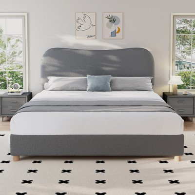AMERLIFE Boucle Bed Frames, Upholstered Platform Bed with Curved Shaped Headboard, Cream