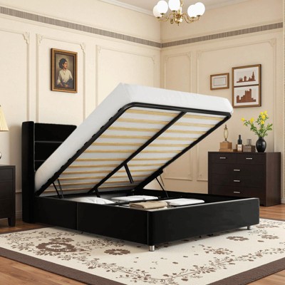 Velvet Upholstered Bed with Lift Up Storage, Wingback Platform Bed Frame, No Box Spring Needed