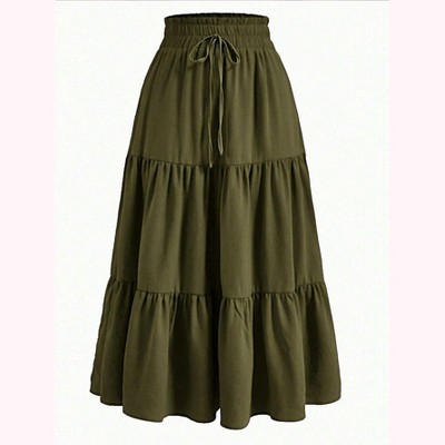 Coolmee Women Midi Skirts Boho Swing Tiered A-Line Elastic Drawstring High Waist Fashion Long Dress