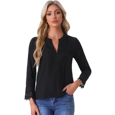 Allegra K Women's Half Button Placket Long Sleeve Lace Crochet Boho Blouse
