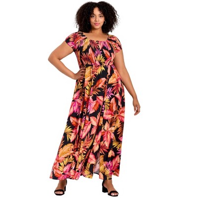 YESFASHION Womens Plus Size Square Neck Floral Print Summer Dress Ruffle Short Sleeve Tie Front Slit Hem Boho Maxi Dress