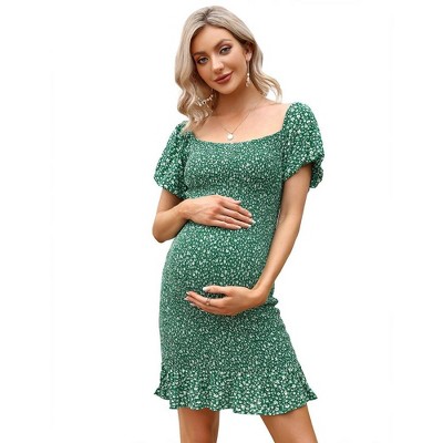 Womens Maternity Short Sleeve Sweetheart Neck Summer Casual Smocked Boho Drawstring Maxi Dress Photoshoot Baby Shower