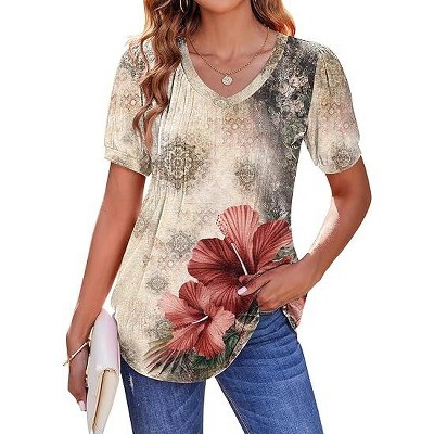 Zeagoo Women's Puff Short Sleeve Boho Shirts Casual V Neck Floral Solid Summer Blouse Pleated Tunic Top