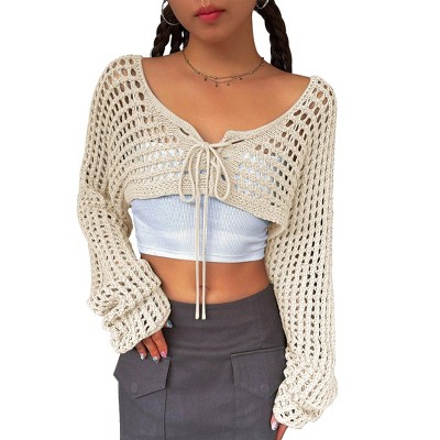 Womens Long Sleeve Crochet Shrug Tie Front Cropped Cardigan Sweaters Knit Bolero Outwear Tops