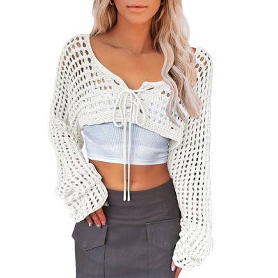Womens Long Sleeve Crochet Shrug Tie Front Cropped Cardigan Sweaters Knit Bolero Outwear Tops