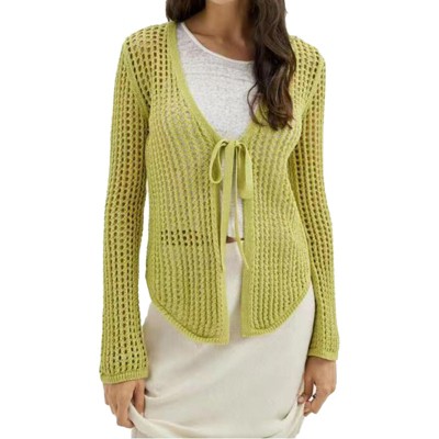 Womens Summer Cardigans V Neck Front Tie Crochet Cardigan Knit Long Sleeve Beach Cover Ups Tops Open Front Cardigan Summer Everyday Outfits