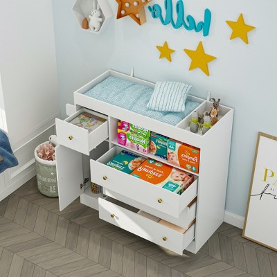 If you are looking for furniture for your little ones room or setting up a nursery for your soon-to-be bundle of joy, a changing table & dresser is a must-have! At Target, find a wide range of changing tables & dressers in a variety of colors and designs. Pick from a collection of drawer dressers designed with a removable changing topper that lets you to use the dresser as a space-saving changing table & storage combo now, and as a drawer dresser in the future as your child grows. Choose from 3-drawer, 4-drawer and 6-drawer dressers with a high-quality painted finish that’s sure to standout in any nursery. Explore a variety of two-toned dressers and mid-century dressers that will make a versatile addition to your modern nursery. Dressers with changing tables offer spacious storage to keep everything your baby needs at your fingertips. The large shelves provide plenty of storage space for towels, diapers and other supplies. Choose from a range of changing tables that have a deep surface for added security while you change your baby as well as a safety strap & a water-resistant pad. Browse through a large collection of changing tables & dressers to find the right pick for you.