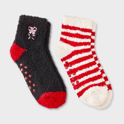 Kid's Embroidered Candy Canes Christmas 2pk Cozy Ankle Socks with Grippers - Black/Ivory/Red 2-5