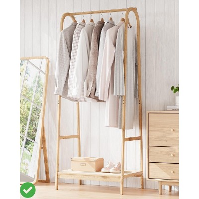 MOEPISY Double Rods Clothing Rack with Mesh Shelf, Hooks & Wheels
