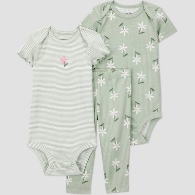 Carter's Just One You® Baby Girls' 3pc Floral Long Sleeve Bodysuits and Ruffle Overalls Set - Green