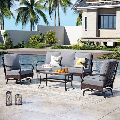 If you love the idea of a centerpiece for evening gatherings, consider patio conversation sets with fire pit tables. These combine cozy seating with a functional fire element, creating a warm and stylish hub for roasting marshmallows or sipping cocktails under the stars. For added movement and comfort, swivel chairs or rocking chairs are a modern favorite, blending relaxation with convenience.