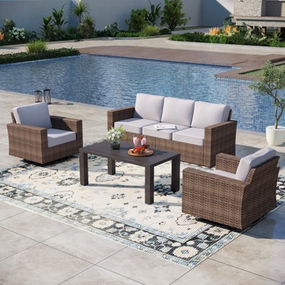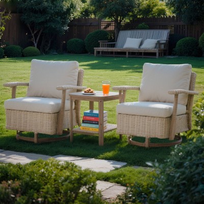 If you love the idea of a centerpiece for evening gatherings, consider patio conversation sets with fire pit tables. These combine cozy seating with a functional fire element, creating a warm and stylish hub for roasting marshmallows or sipping cocktails under the stars. For added movement and comfort, swivel chairs or rocking chairs are a modern favorite, blending relaxation with convenience.