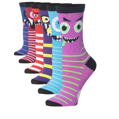 Tipi Toe Women's 6 Pack Colorful Striped Monster Smiles Patterned Lightweight Crew Socks