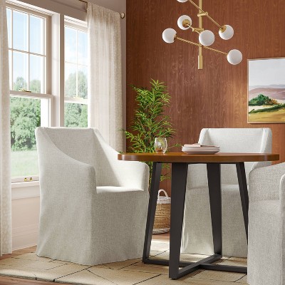 Create a welcoming setup with dining chairs that help transform your space. Elevate your open kitchen, breakfast counter or dining room with the right furniture & comfy seating. Check out Target.com to find a variety of dining room chairs, from clean-lined, minimal wood or rattan chairs to traditional upholstered armchairs for your formal dining room. Keep things clean & elegant with modern dining chairs or go vintage with mid-century modern designs that combine style & functionality. Embrace a casual, rustic aesthetic with farmhouse-style dining table & chairs with ladderback accents, usually made of wood or powder-coated steel. Need ideas to spruce up your traditional dining room? Make a decor statement with an accent chair like a dining armchair or a high-back chair with upholstered armrests. It brings luxurious comfort & pops of pattern with velvet or tufted upholstery. Mix it up with upholstered ottoman, stools & benches for a more casual setup. A mix of stationery & swivel styles work great as dining room chair for creating a dynamic seating style. Make room for more with side chairs, side benches & barstools that fit great in less traditional settings like a kitchen table or an eat-in counter. Stackable chairs also make a versatile pick for space-saving dining room decor.