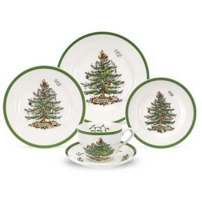 Spode Christmas Tree 5-Piece Holiday Dinnerware Set - Festive Earthenware Tableware with Plates, Teacups, Saucers - Microwave, Dishwasher Safe
