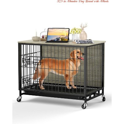 38 Inch Rustic Dog Crate Furniture with 3 Doors and Locking Wheels