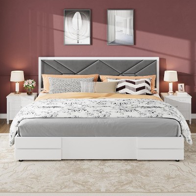 COZONY Upholstered Bed Frame with Storage Drawers, Built in USB Charging Ports Brown Finish