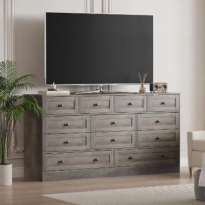 Hardware and accents on the dressers can add a finishing touch to its overall look. Dressers can come with a variety of hardware options, including knobs, handles, and pulls. Consider the style of hardware that would work best with your bedroom dressers and décor. Some dressers also have decorative accents, such as carved details or mirror insets that can add visual interest to the piece. You can also get creative by paring dressers with a chest or a cupboard and enjoy extra storage in less space. Dressers can be multifunctional, for example you can rest your television at a comfortable viewing height or place a mirror on the top and keep your makeup or jewelry in the drawers. Spacious dressers can help you store clothes, toys or seasonal items and other essentials. Choose dressers that would suit the overall look and feel of your room and a material and finish that fits your style.