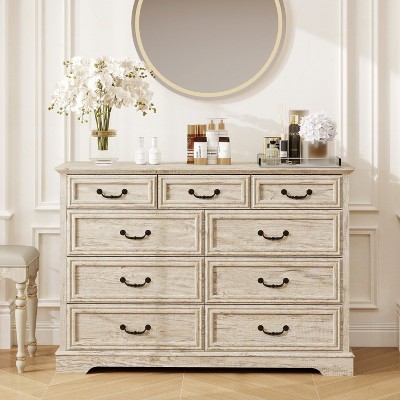 Hardware and accents on the dressers can add a finishing touch to its overall look. Dressers can come with a variety of hardware options, including knobs, handles, and pulls. Consider the style of hardware that would work best with your bedroom dressers and décor. Some dressers also have decorative accents, such as carved details or mirror insets that can add visual interest to the piece. You can also get creative by paring dressers with a chest or a cupboard and enjoy extra storage in less space. Dressers can be multifunctional, for example you can rest your television at a comfortable viewing height or place a mirror on the top and keep your makeup or jewelry in the drawers. Spacious dressers can help you store clothes, toys or seasonal items and other essentials. Choose dressers that would suit the overall look and feel of your room and a material and finish that fits your style.